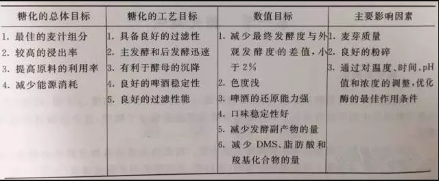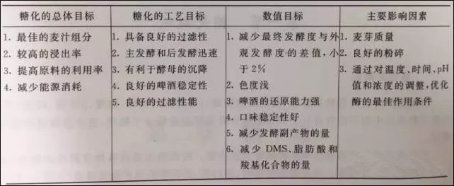 糖化的目的是利于各种酶的作用,使不溶性物质溶解出来,从而得到尽可能多的溶解物并且使麦汁组成适宜。